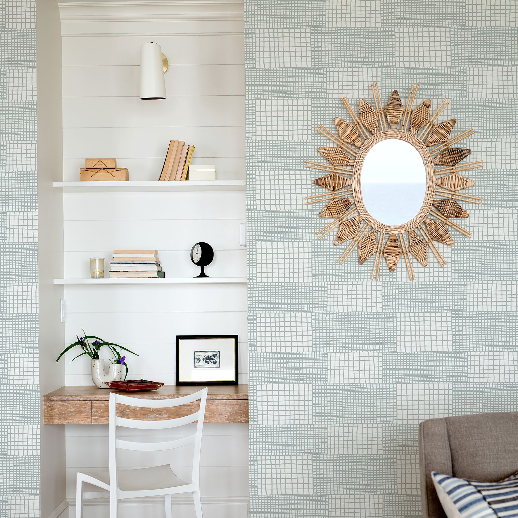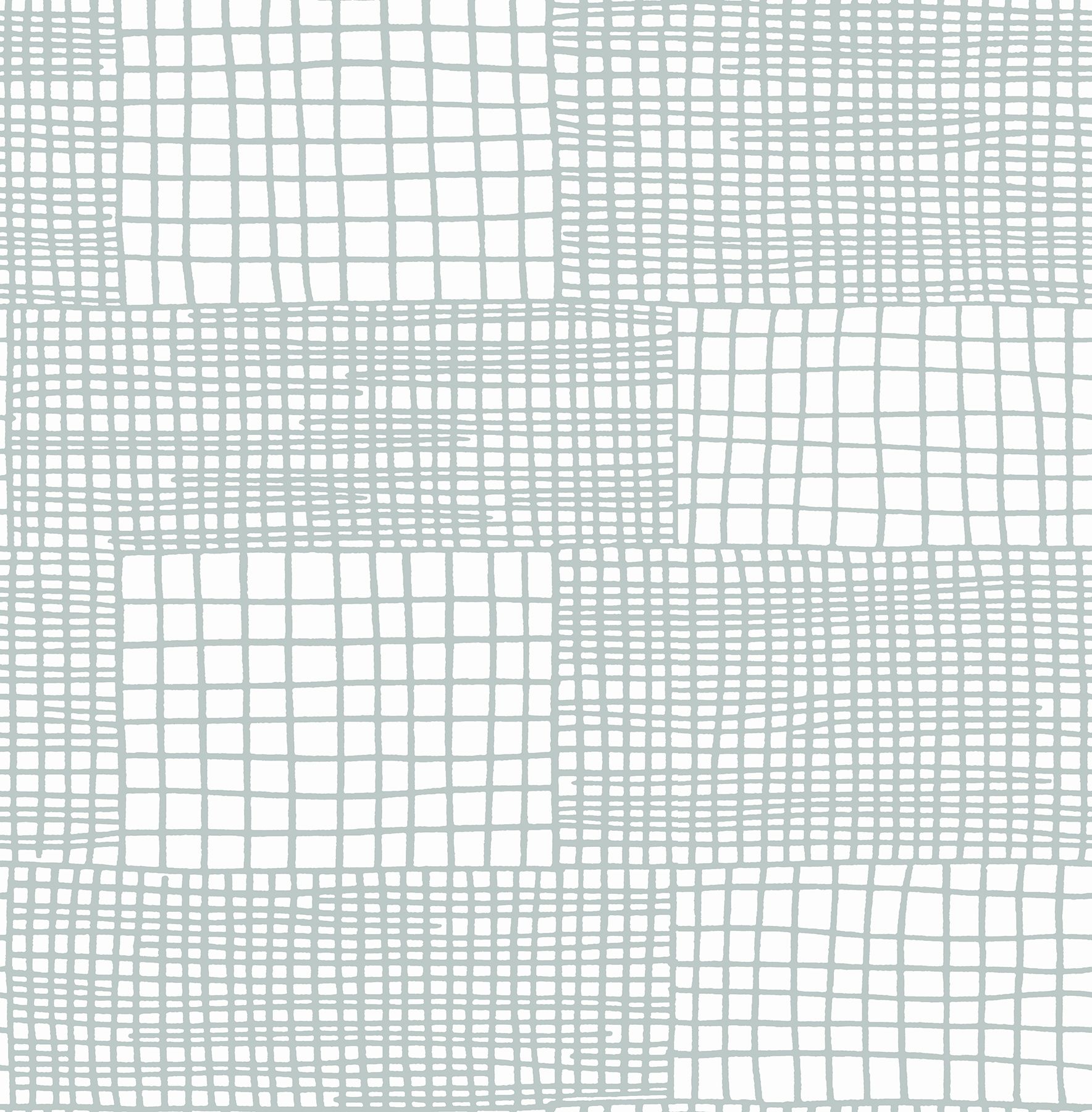 Dimensional and abstract, this geometric print is comprised of hundreds of intersecting lines of various widths. Its muted aqua print effortlessly complements the crisp white background.