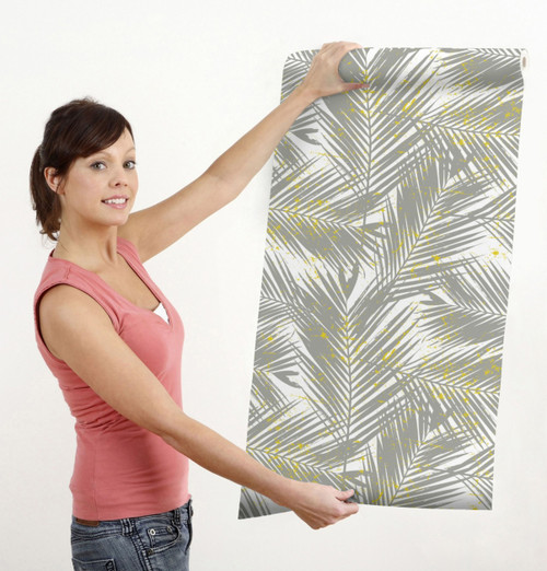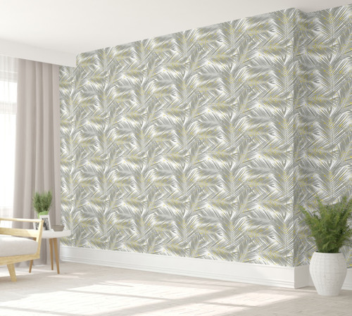 GW128011 Gray Palms with Yellow on White Peel & Stick Wallpaper Roll 20.5" W x 18 ft. L